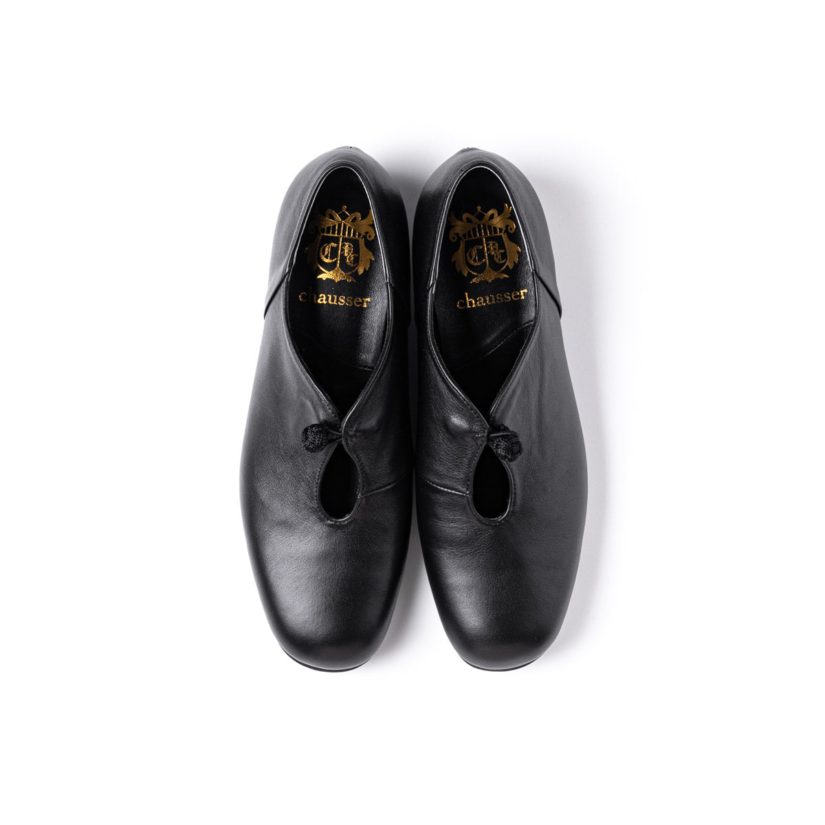 chausserのUフロントチャイナボタンシューズはスクエアトゥの木型は大人っぽくすっきりとしたシルエットです。甲に付いているチャイナボタンが印象的で可愛らしくもありマニッシュな印象も持ち合わせている一足です。
