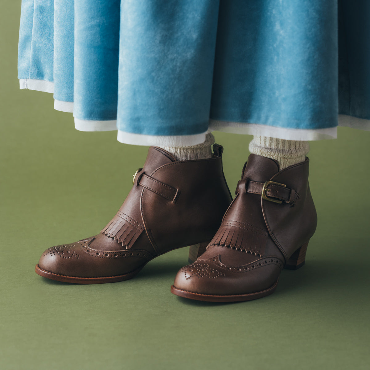 chausserのシングルモンクヒールブーツはウイングチップとメダリオンが施されており上品で洗練された印象です。キルトは取り外し可能なため、気分やシーンに合わせてスタイルを変えることが可能。ゆったりとした木型を採用しているため、足入れが良く快適な履き心地となっています。エレガンスと快適さを兼ね備えた一足です。