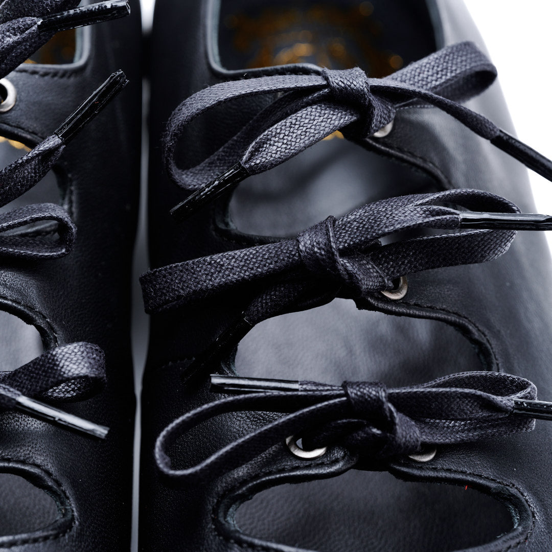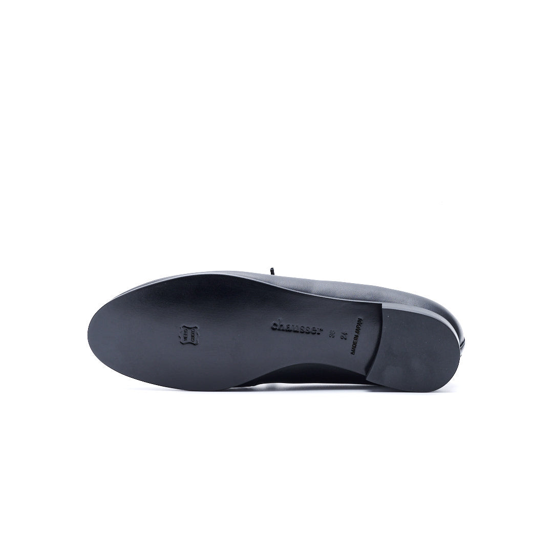 chausserのリボンフラットシューズは甲部分の3つのリボンが華やかでエレガントな印象を与え、つま先をすっきりとさせた木型を使用することでシャープに足元を引き締めます。アッパーには軽く通気性に優れている羊革を使用しています。日常使いから特別なシーンまで幅広く活躍できる一足です。