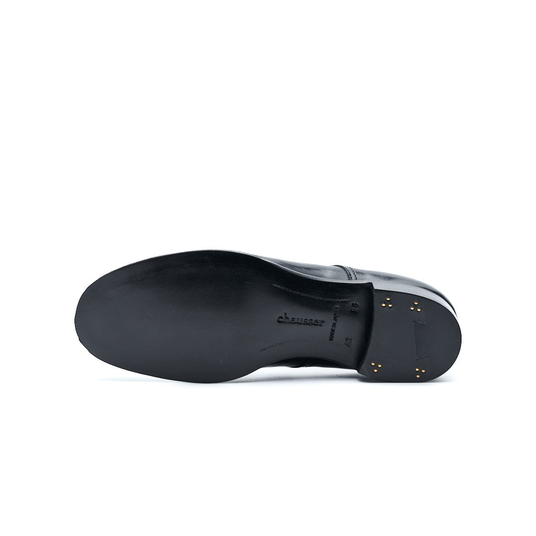 chausser classic lineのコードバンプレーントゥレースアップシューズはアッパーは新喜皮革のシンコードバンを採用しています。従来のナチュラルコードバンに比べ、ワックスとオイルの量を増やしたことで曲げや裂けなどに強くしなやかで柔らかいコードバンです。オイリーな質感のため履き皺などでプルアップをしネイビーの濃淡を感じることができます。トゥをポッコリとさせ、クラシカルなデザインの中にもchausserらしさを取り入れています。オンオフ問わず幅広いスタイリングに合わすことができる一足です。