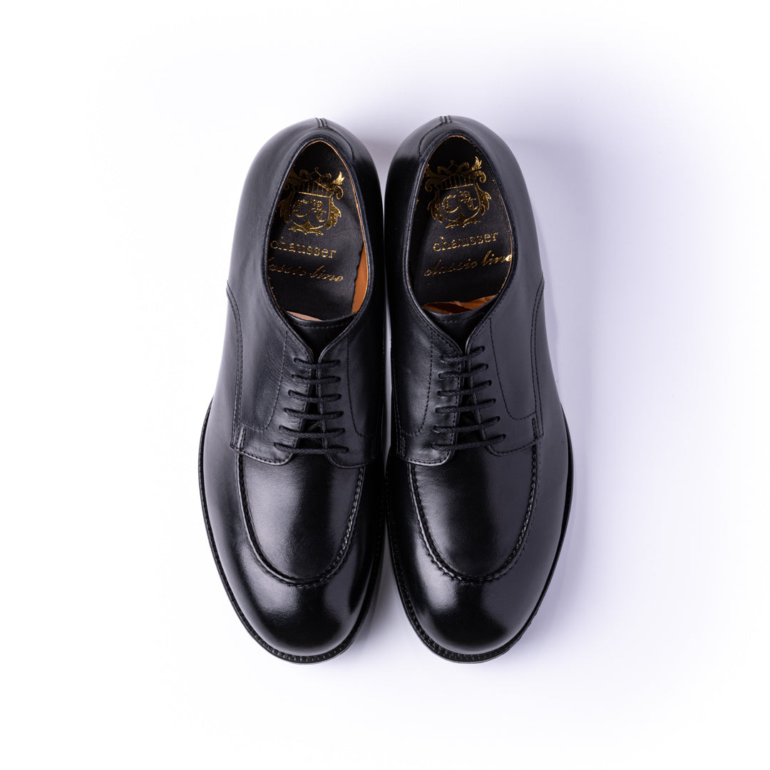 chausser classic lineのUモカレースアップシューズは土踏まずからかかとにかけて木型を絞り込むことで、吸い付く様なフィット感に仕上げています。グットイヤーウェルト製法はソールの返りが硬くなりやすいですが、オイルを多く含ませたフレックスソールを採用しているため、足馴染みが非常に良いです。モカ部分は職人による手の込んだスキンステッチになっています。トゥをポッコリさせ、クラシカルなデザインの中にもchausserらしさを取り入れています。