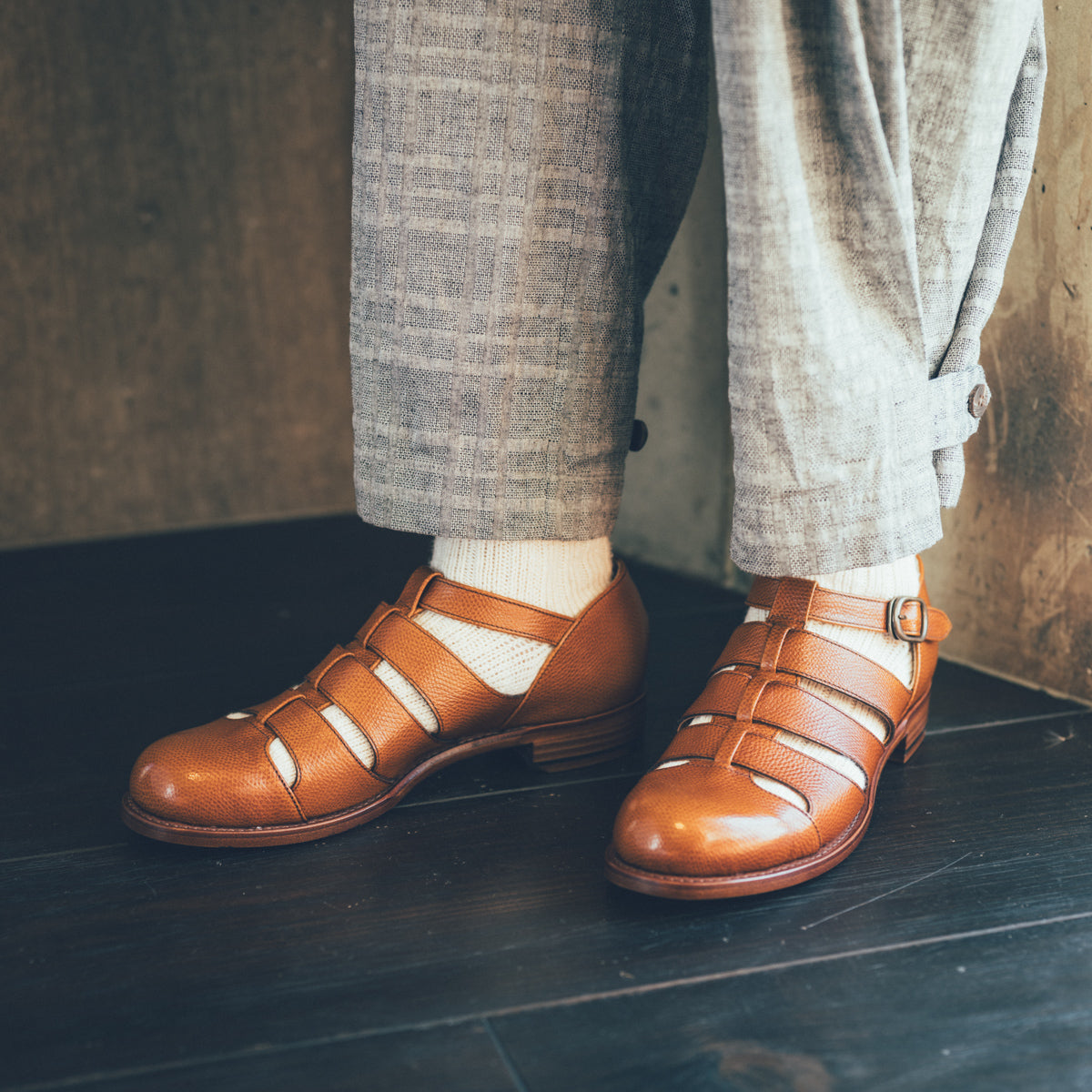 plus by chausserのグルカシューズはアッパーにはアノネイ社のグレインレザーを使用しています。キメの細かなシボと光沢感は高級感のある足元を演出してくれます。フック式ストラップを採用しているため容易な着脱が可能です。またグッドイヤーウェルト製法のため重厚感と耐久性があり、履くほどに足に馴染む一足です。