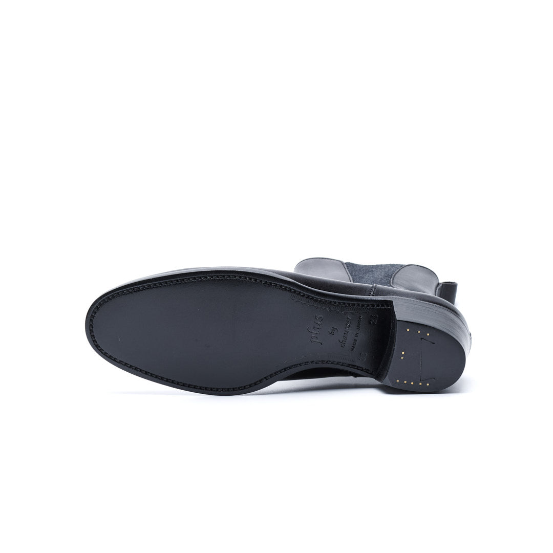 plus by chausserのサイドゴアヒールブーツはつま先がやや長めの木型を採用し、後足部にかけて絞り込んだデザインとなっているためメリハリのある美しいフォルムを実現しています。アッパーに使用している馬革は繊維が細かく、柔軟でありながらも独特の張りがあり、フィット感が良いのが特徴です。グッドイヤーウェルト製法を採用しているため重厚感と耐久性があり、履くほどに足に馴染みます。マニッシュとエレガントさを兼ね備えた一足です。