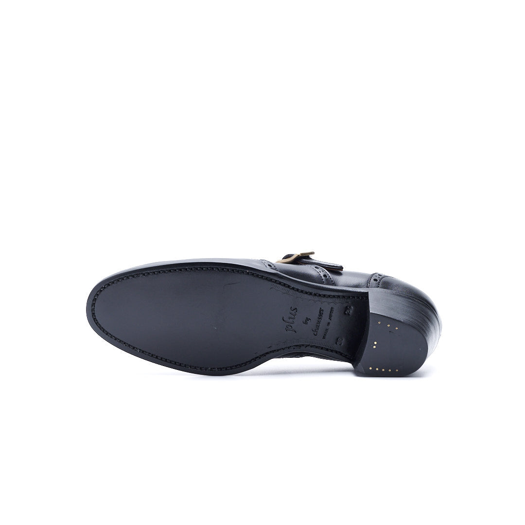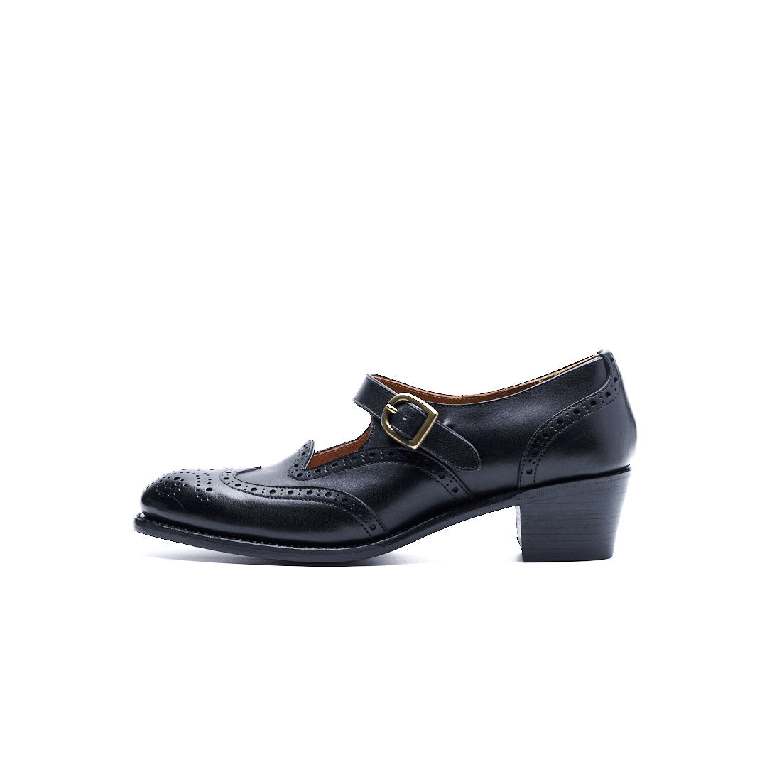 plus by chausserのウイングチップヒールシューズはクラシカルなウイングチップのディテールが施され、上品な雰囲気が魅力的な一足です。ストラップパンプスのスタイルが足元をよりエレガントに演出し女性らしいラインを引き立てます。つま先はやや長めの作りで後足部にかけて絞りを効かせており、太めのヒールで安定感があります。グッドイヤーウェルト製法を採用することで重厚感と耐久性があり履くほどに足に馴染みます。