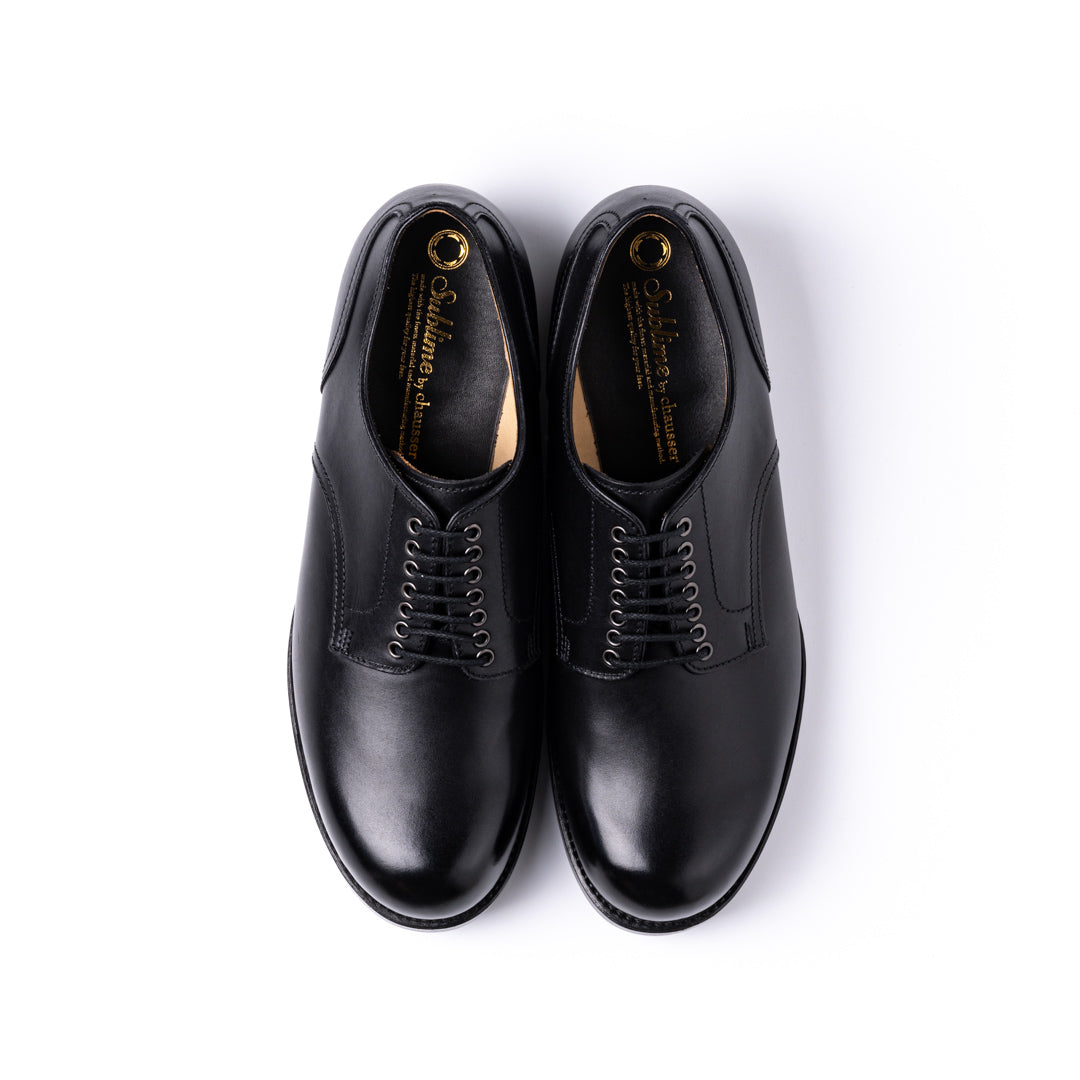 Sublime by chausserのプレーントゥレースアップシューズはアッパーはキメの細かいデュプイ社のサドルカーフを使用。柔らかいライニングとオイルを多く含ませたフレックスソールを採用しているため、足馴染みが良いです。chausserらしさのあるラウンドトゥの木型とシューホールの多いデザインが特徴です。