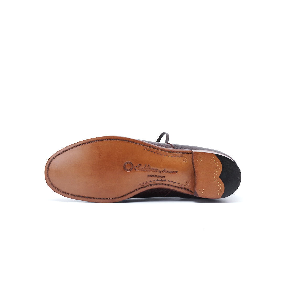 Sublime by chausserのUモカレースアップブーツはアッパーはアノネイ社のグレインレザーを使用。キメの細かなシボと光沢感は高級感のある雰囲気を演出します。柔らかいライニングとオイルを多く含ませたフレックスソールを採用しているため、足馴染みが良いです。ラウンドトゥにスキンステッチを施していることでモカの凹凸がはっきりと見えます。ロウ引きの平紐にブラックのハトメはカジュアルシーンで履くこともおすすめです。