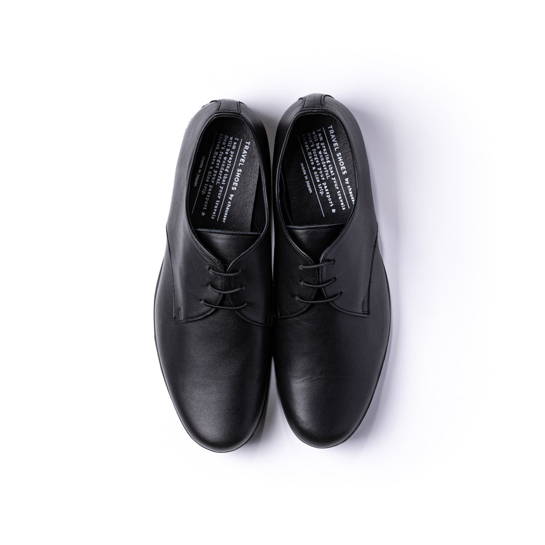 TRAVEL SHOESのプレーントゥレースアップシューズは外羽根タイプのため、甲高の方に、よりおすすめです。ビジネスからカジュアルまでシーンを問わず着用できる汎用性の高さとスタイリングを選ばないシンプルなデザインが特徴。TRAVEL SHOESは旅をテーマにしたシリーズのため、旅先への持ち運びが便利なシューズ袋を付属しています。