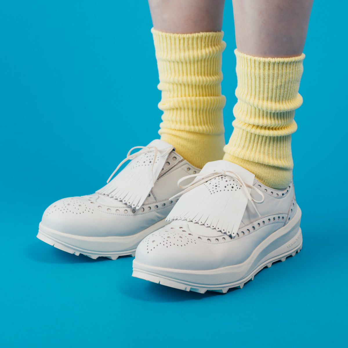 Active TRAVEL SHOESのウイングチップシューズは等間隔に並んだ丸のパンチングがショセらしいマニッシュな雰囲気を表現しています。別売りのキルト(TRA-K)との相性も良く足元に華やかさを演出してくれる一足です。Activeは全品番、履き口部分にパッドが入っていることで長時間の歩行を快適にサポートします。また内側羽根部分のスリットにゴムが入っているため靴紐を解かずに着脱が可能。アッパーは従来のTRAVEL SHOESと同様に防水加工を施したレザーを使用しています。ソールにはVibram社のメガグリップを採用し、高い耐久性と卓越したグリップ性を実現、クッション性にも優れています。TRAVEL SHOESは旅をテーマにしたシリーズのため、旅先への持ち運びが便利なシューズ袋を付属しています。